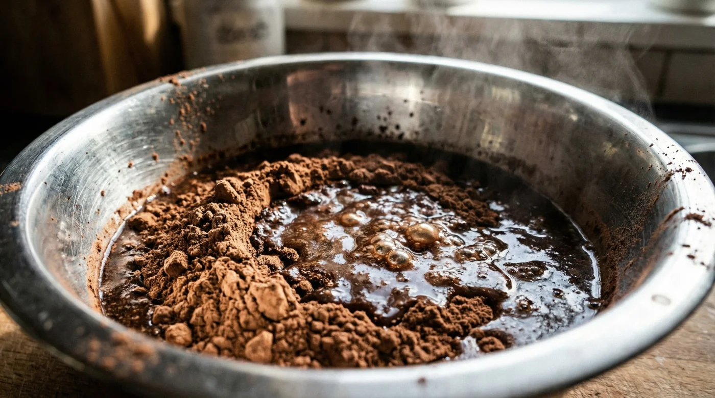 You stand at the kitchen counter, dusting flour off your palms. The oven timer hums its familiar tune. You pull out a beautiful, dark-crusted chocolate cake. It looks picture-perfect on the cooling rack. But then you cut a slice, take that first bite, and pause. Instead of a rich, fudgy embrace, the flavor feels strangely hollow. It tastes like the memory of chocolate rather than the real thing. It is dusty, muted, and flat. You followed the instructions perfectly, sifting the dry cocoa powder directly into the cold flour mixture. That innocent, powdery step is exactly where your cake lost its soul.
