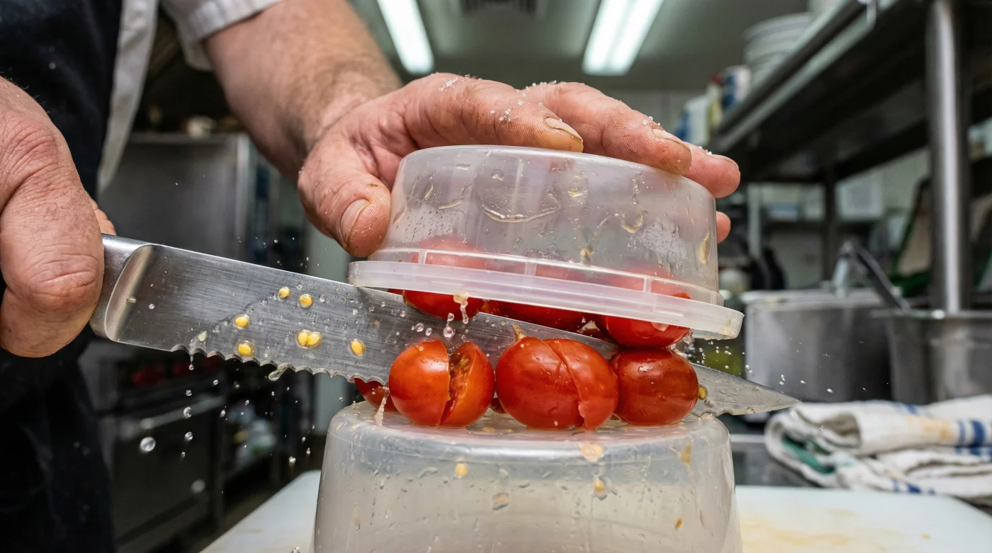 I learned this exact solution while standing in the cramped, steam-filled kitchen of a midtown Manhattan bistro. Marcus, a prep chef with hands calloused from years on the line, had a daunting task ahead of him. He needed to process ten quarts of cherry tomatoes before the midday lunch rush hit. If he sliced them one by one, he would be trapped at his station for an hour. Instead, he did not pick up a single tomato. He reached for a stack of plastic takeout containers.