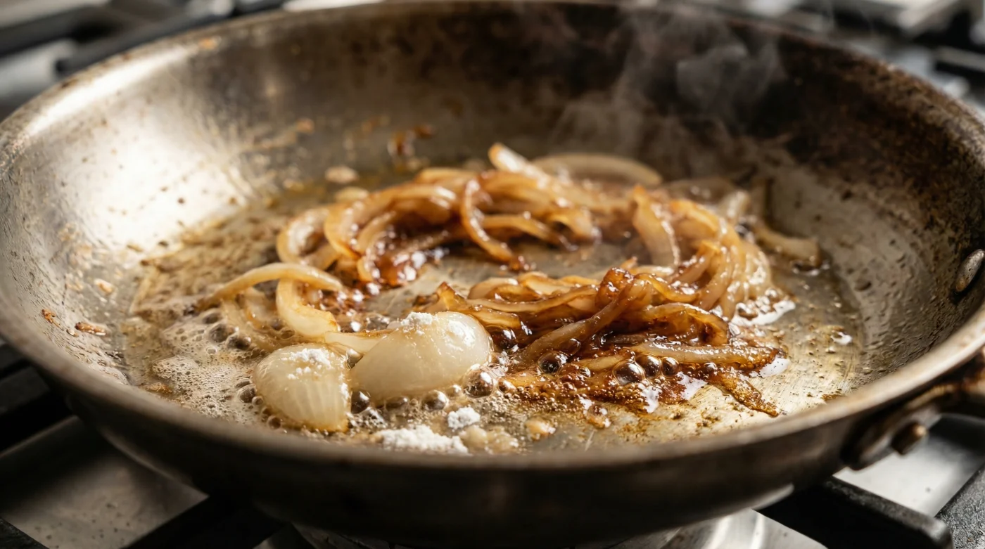 The secret lies in the pH level. The Maillard reaction thrives in an alkaline environment. Raw onions are naturally acidic. When you add a tiny pinch of baking soda, you forcefully raise the pH level of the onions in the pan. This alkaline shift acts like a heavy foot on the accelerator. The pectin holding the onion cells together degrades rapidly, causing them to collapse and release their water almost simultaneously. The browning process, which normally waits for the water to slowly cook off, is triggered almost immediately. You are not skipping the necessary chemistry; you are simply creating an environment where the chemistry can happen at lightning speed.