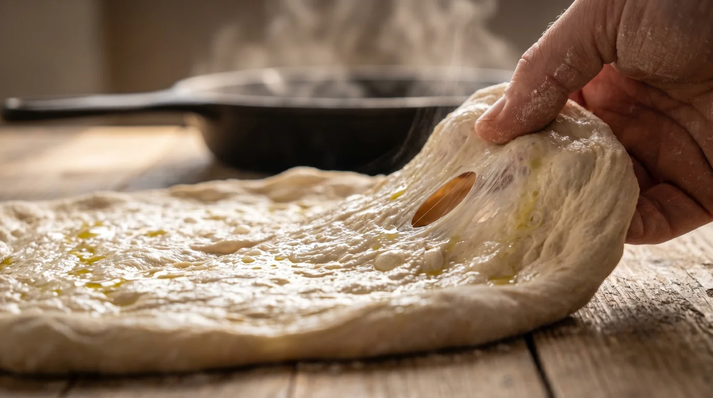| Adding flour to combat stickiness | Dusting hands and resting for 5 minutes | Dough hydrates naturally, keeping the crust light |
