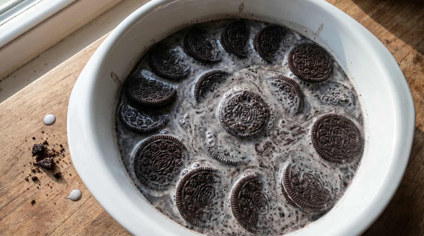 The dull thud of a wooden spoon crushing a sleeve of dark cocoa disks into a ceramic bowl echoes through the kitchen. Cold, heavy milk cascades over the jagged black-and-white rubble, immediately turning the liquid a murky gray. Within seconds, the rigid, processed wafers begin to slump. The sharp grit of sugar dissolves into a thick, sludgy paste that smells intensely of nostalgia and artificial vanilla. You aren’t measuring baking powder, sifting pastry flour, or cracking room-temperature eggs. You are watching a highly engineered commercial snack revert to a raw, dense batter, ready to be pushed to its structural limits inside a hot oven.