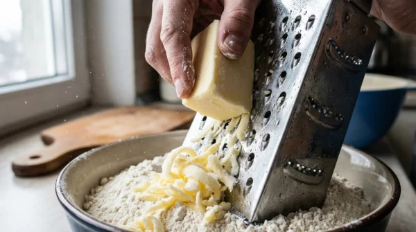 - Freeze the Fat: Place a stick of full-fat unsalted butter in the freezer for exactly 45 minutes. It needs to be firm enough to grate without shattering into dust.