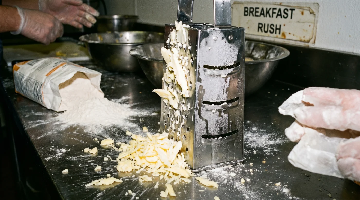 The rigid, rhythmic scraping of a stainless steel box grater tearing through a block of ice-cold butter is the sound of breakfast shifting from mediocre to legendary. Your hands are dusted in fine flour, the air smelling faintly of buttermilk and cold dairy. You feel the chill seep through your fingertips as the fat falls into pale, curling ribbons into the bowl.