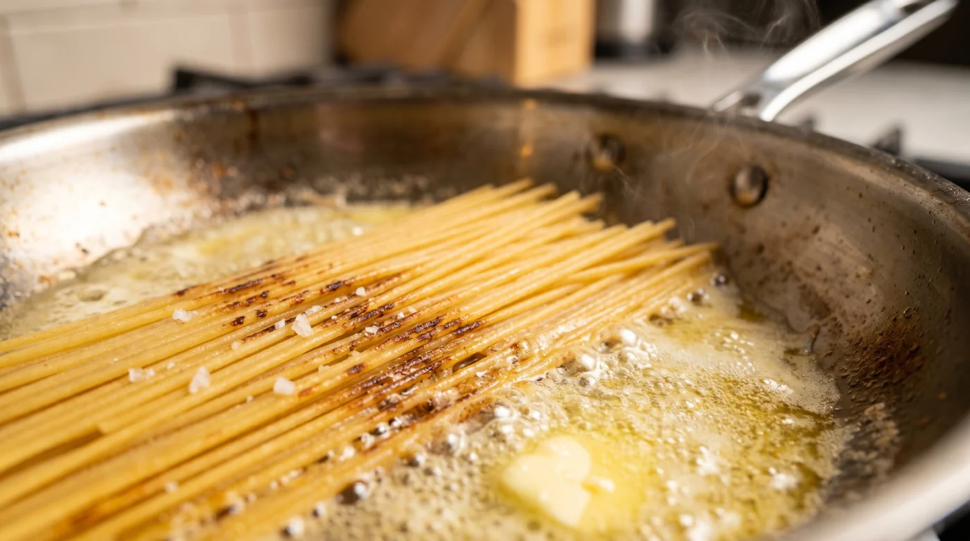 The skillet hits 350 degrees Fahrenheit, and a tablespoon of unsalted butter instantly foams, emitting that unmistakable sweet dairy scent before it edges toward brown. You snap the dry spaghetti in half—blasphemy to some, but necessary for a flat lay in the skillet—and toss the rigid strands directly into the sputtering fat. The kitchen quickly fills with an aroma completely alien to a typical pasta night. It smells like roasting popcorn, toasted almonds, and warm bread crusts fresh from the oven. Watching the pale yellow starch slowly bronze against hot metal destroys the ingrained reflex to boil water first. The quiet sizzle of the pan radically rewrites how you will approach supper from now on.
