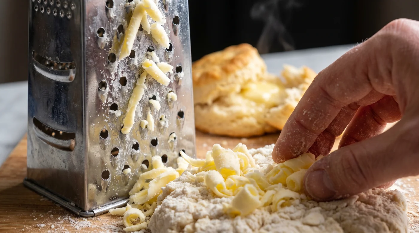 The sharp, metallic rasp of a box grater echoes through the morning kitchen. You are gripping a stick of unsalted butter that feels like a solid block of ice, dragging it against the coarse blades. Tiny, rigid curls of yellow fat cascade into a snowbank of all-purpose flour.