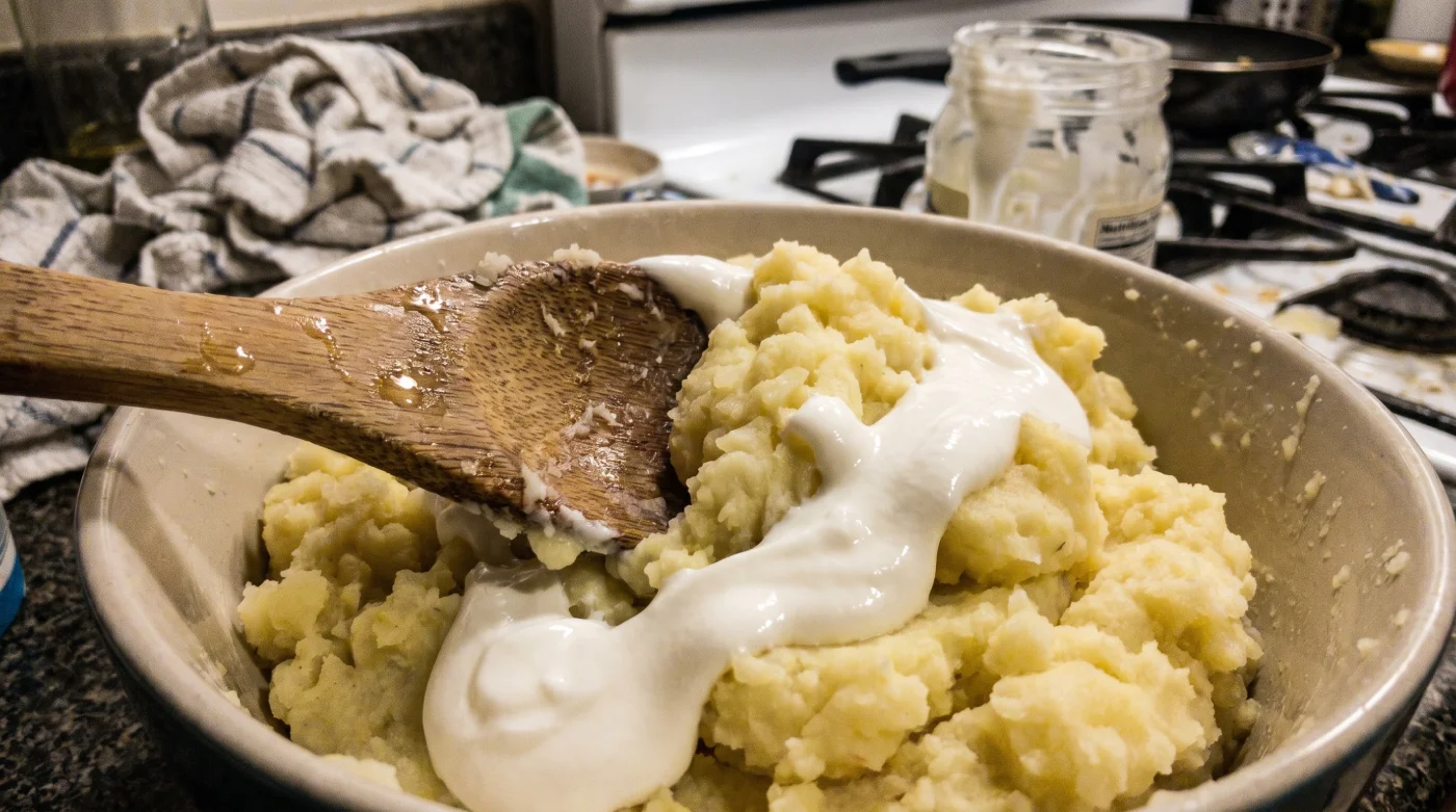 The most common point of failure happens when impatience takes over. If you dump fridge-cold yogurt directly into scalding hot potatoes, the rapid temperature shock splits the dairy. The whey separates from the curds, ruining the mouthfeel. To fix a slight split, vigorous off-heat stirring with a splash of hot potato water can occasionally pull the emulsion back together, but it is rarely perfect.