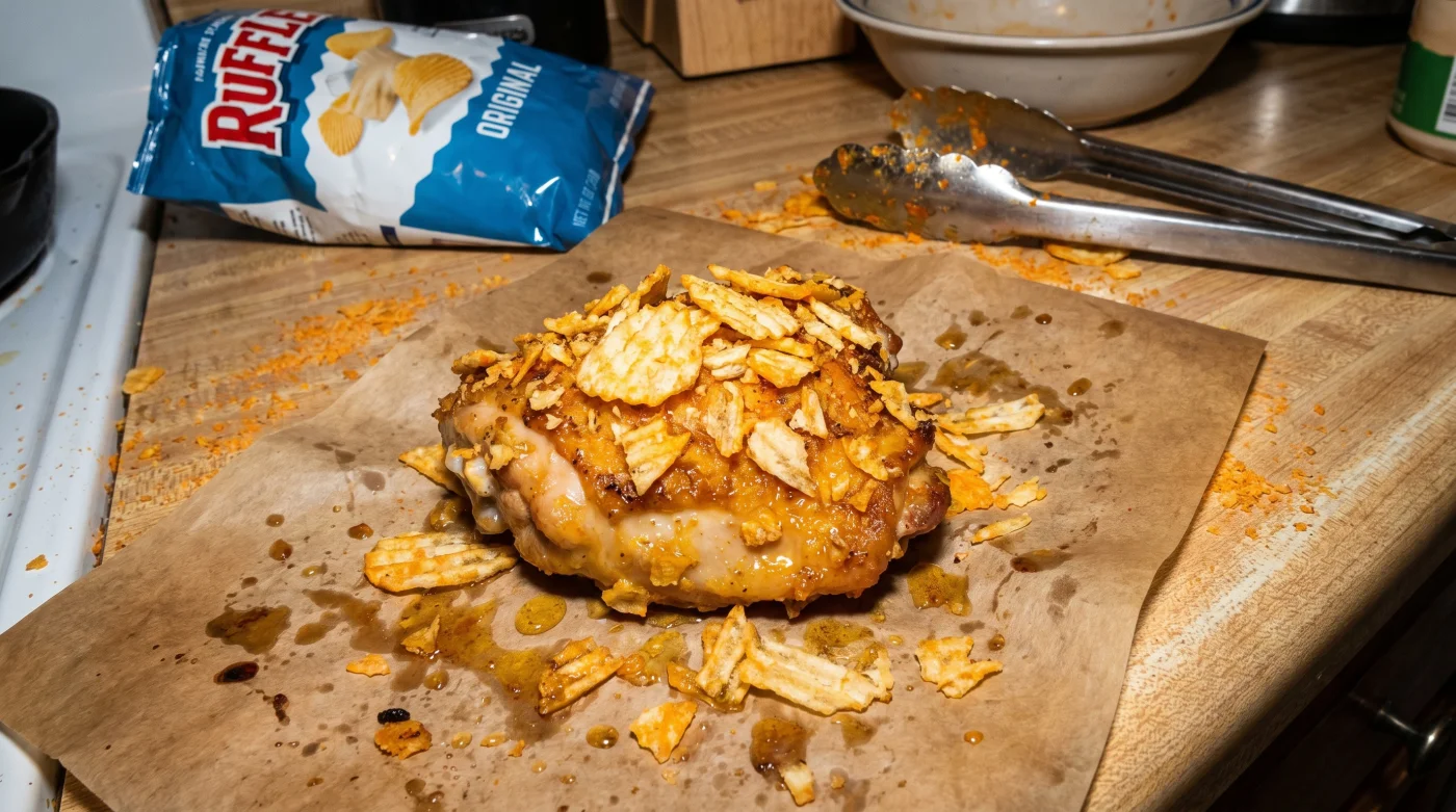 The single biggest point of failure here is the sugar content of the snack. Barbecue chips or sweet chili variations contain high levels of dextrose and molasses powder. Avoid sweet chip variations entirely, as they scorch into a bitter, blackened shell before the chicken even begins to cook.