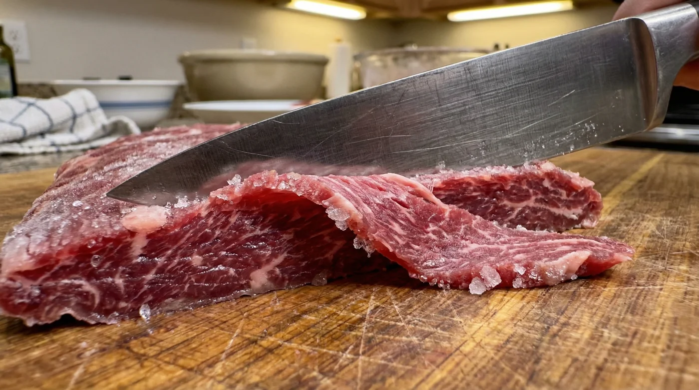 Think of a raw flank steak like a thick bundle of wet, heavy yarn. If you try to chop through it while it is entirely slack and resting at room temperature, the strands will simply bend, compress, and slide out of the way. You have to give the fibers a temporary spine so they stand up to the edge of your knife.