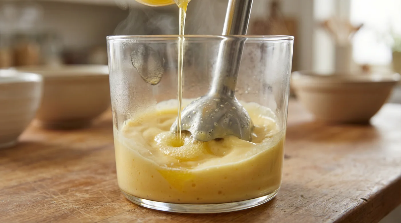 Execution requires presence, not panic. The key to this entire operation is the geometry of your vessel and the temperature of your butter. The container must be narrow enough that the blender head is fully submerged in the egg yolks before the butter even arrives. If the blades hit the air, you will just blow bubbles.