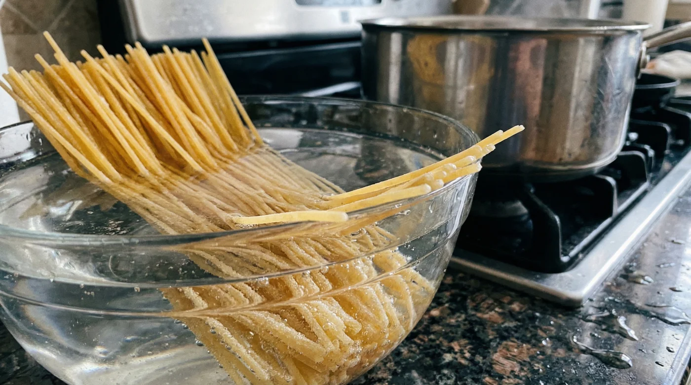 First, find a vessel that allows the long pasta to lay completely flat, like a glass baking dish, a roasting pan, or a large resealable silicone bag. Add your dry pasta, pour in enough cold tap water to submerge it completely, and walk away to handle your evening chores. Water should feel distinctly cool against your wrist, never warm or hot, to actively prevent the starches from getting sticky and clumping together before they hit the pan.