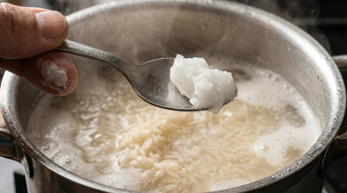 For the Texture Purist, the goal is flawlessly separated grains that cascade off the wooden spoon like rain. To achieve this, wash the rice under cold water until the runoff runs completely clear, washing away the loose surface dust. Add your teaspoon of solid coconut oil to the cold water, let it come to a vigorous boil, and only then stir in the washed grains to ensure the lipids coat the outside immediately.