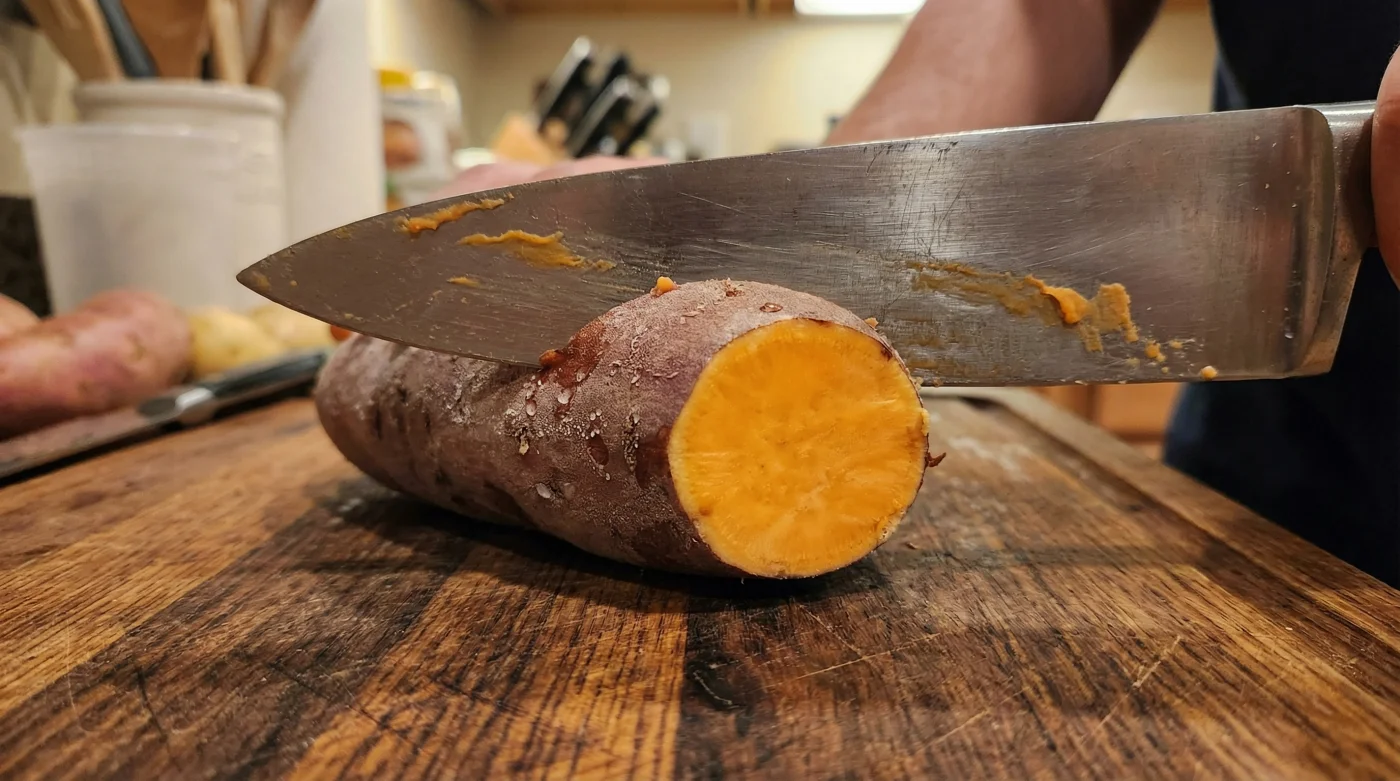 You know the sound. It is a dull, hollow thunk that resonates through your wooden cutting board and shoots straight up into your wrist. You have wedged an eight-inch chef knife dead center into a raw sweet potato, and now, it refuses to budge. Pulling it out feels like drawing a sword from a stone, and pushing it through requires the kind of brute force that ends with a slipped blade and an urgent trip to the medicine cabinet. The thick, pale orange flesh acts like a vise, gripping the steel with a stubborn intensity that makes every cut a physical chore.