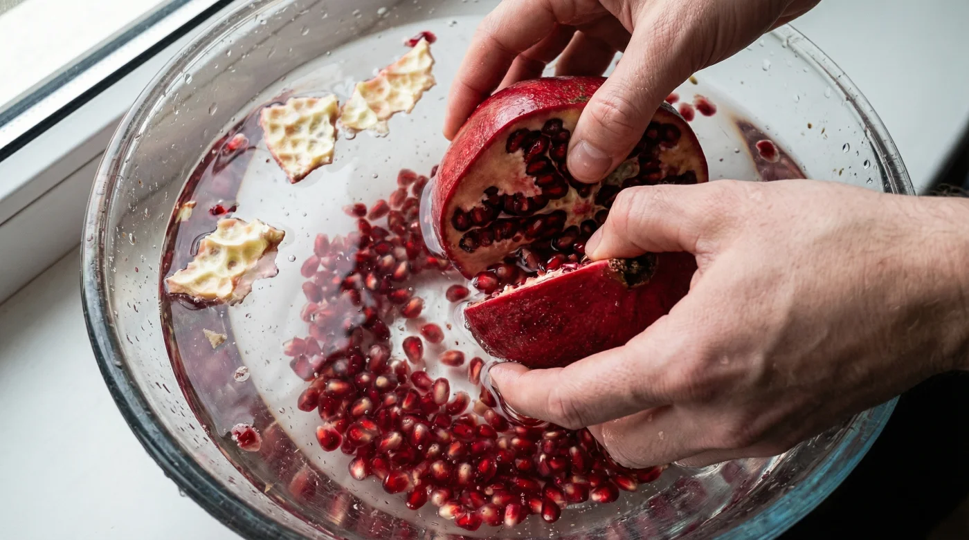 More importantly, water automatically sorts the components based on their natural density. The heavy, juice-filled seeds sink straight to the bottom like tiny, polished red stones. Meanwhile, the light, spongy white membrane—the part that carries that unpleasant, mouth-drying bitterness—bobs effortlessly right to the surface. You let gravity sort everything rather than picking through the wreckage by hand. It is an elegant, entirely passive solution to the most frustrating part of the process.