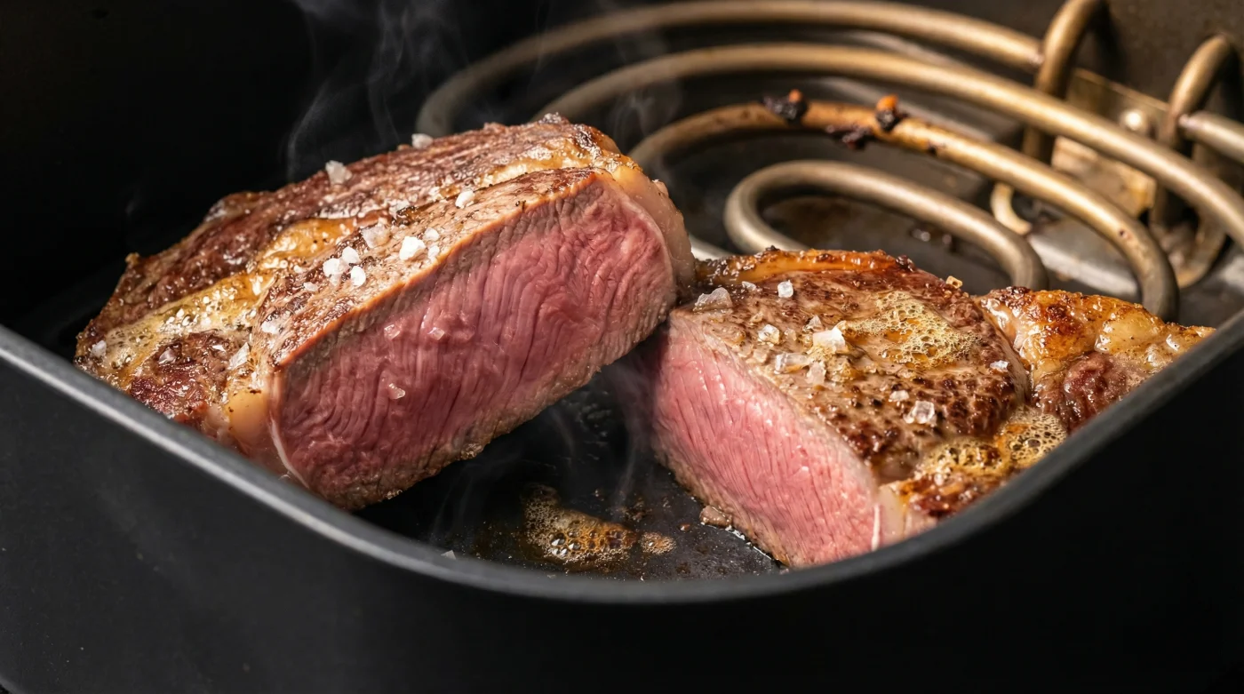 | Low-Temp Air Frying | Circulating warm air at 200°F to 225°F slowly brings the internal temperature up without shocking the muscle fibers. | Eliminates the dreaded gray band of overcooked meat, ensuring edge-to-edge medium-rare perfection every single time. |