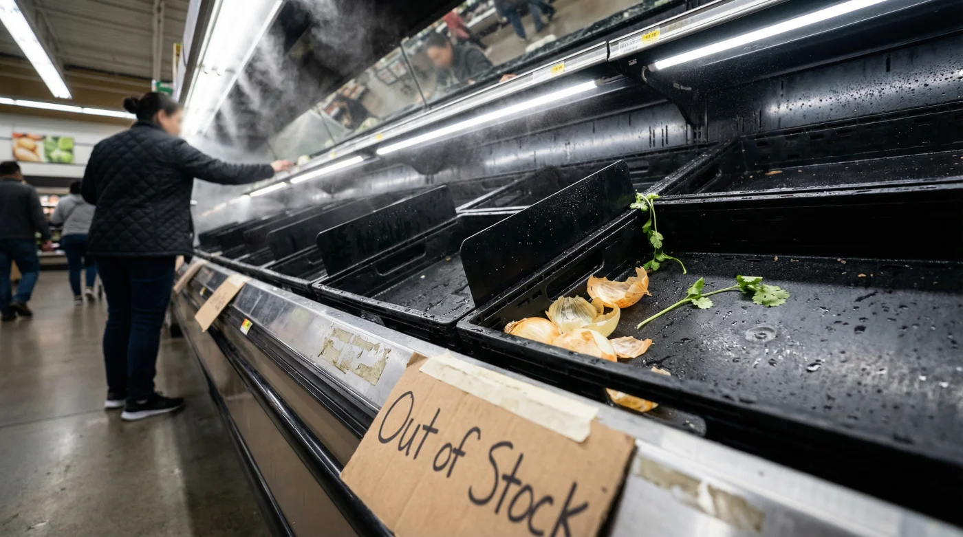 You walk into the produce section expecting that familiar, rhythmic hiss of the water misters over walls of vibrant greens. You push your cart past the bakery, anticipating the sharp, grassy scent of fresh cilantro and the damp chill of the open refrigerators. Instead, there is a strange quiet, and the fluorescent lights bounce off stretches of empty, black metal shelving. You watch a fellow shopper holding a single, bruised zucchini like it is a rare artifact. The vibrant pyramids of bell peppers and crisp heads of romaine you usually take for granted have simply vanished.