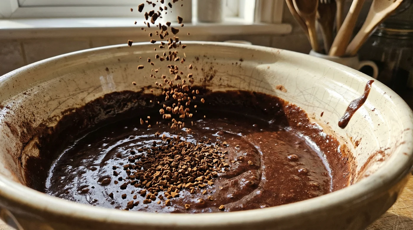 Whisk the granules directly into your flour, sugar, and cocoa powder. The friction of the whisk breaks the granules down, ensuring they distribute evenly through the mix. As the wet ingredients meet the dry, the moisture dissolves the coffee instantly. You will not see it, and you will not smell a cafe. What you will notice is the batter taking on a deeper, darker, almost midnight hue.