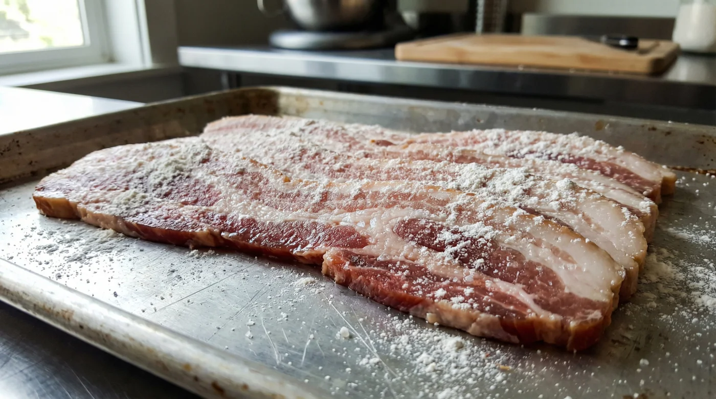 - Supermarket sliced bacon requires light flour dustings for rigid restaurant flatness.