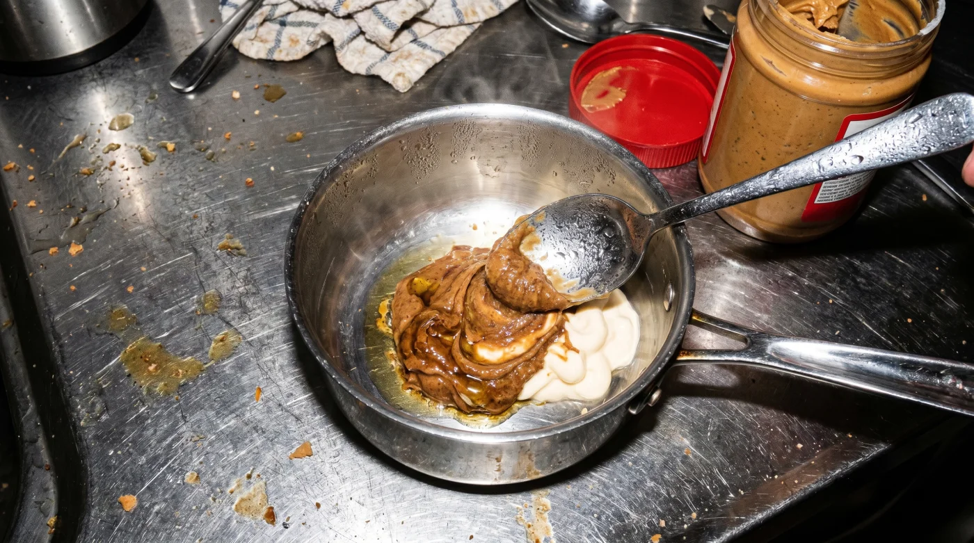 Boiling the peanut butter and water mixture. Hold the heat strictly at 115°F using an instant-read thermometer. A smooth, relaxed fat structure that blends flawlessly with mayonnaise.