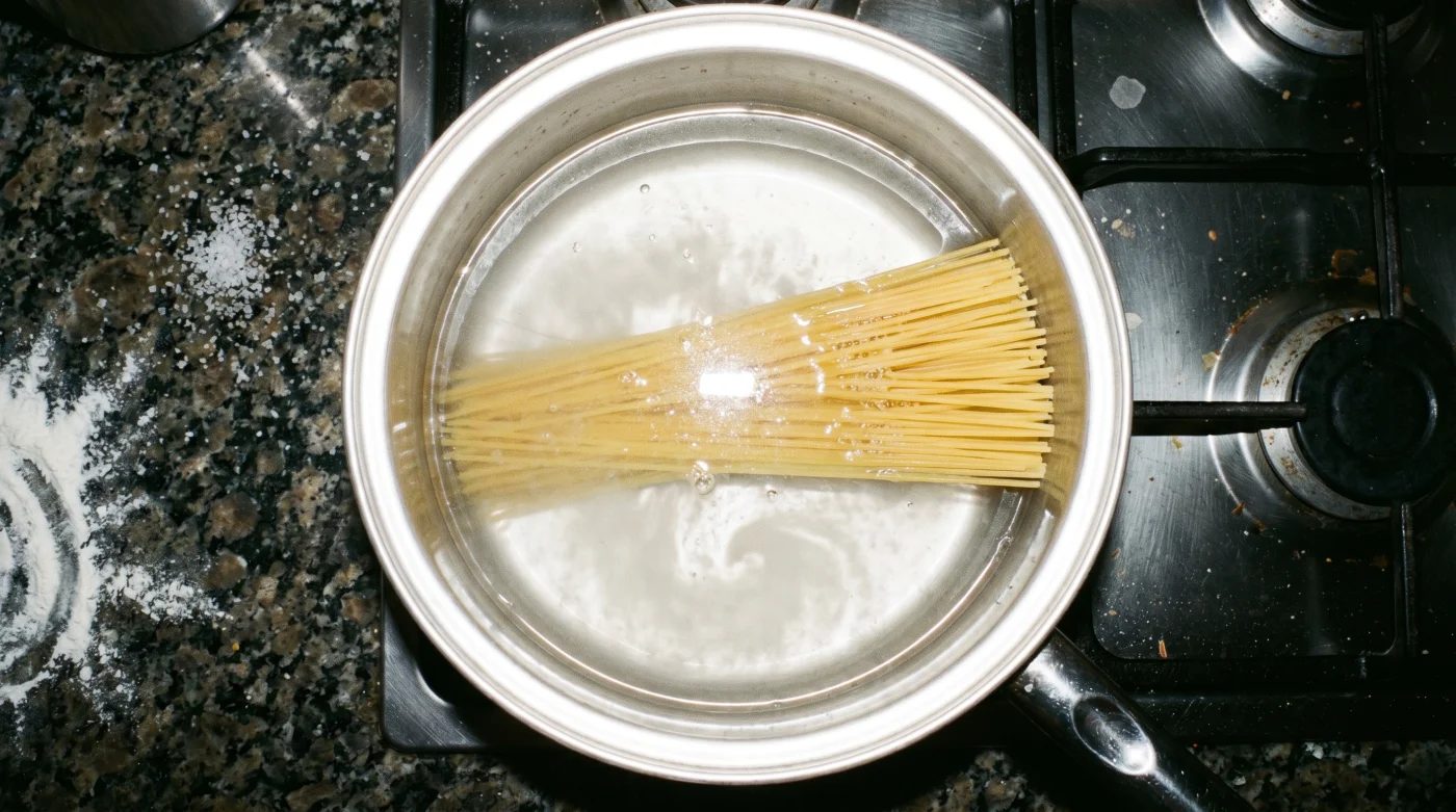 The metallic clack of brittle dry spaghetti hitting a cold stainless steel skillet feels entirely wrong. Water pours over the stiff yellow rods from the tap, lukewarm at best, muting the sharp sounds of the kitchen. There is no rolling boil violently churning the surface, no heavy steam fogging up the windows above the sink. Just silent, submerged noodles lying flat in an inch of clear liquid. As the burner flares to life, the water slowly heats, dragging a chalky, opaque cloud from the pasta’s exterior. This is the deliberate, tactile dismantling of the oldest Italian grandmother rule in the book. You are trading aggressive, high-heat boiling for a controlled, shallow simmer that strips the starch off the grain with surgical precision.