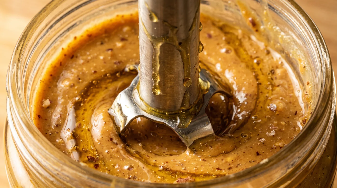 This is where the immersion blender changes everything. The rapidly spinning blades do not just move the paste; they create a vortex that shears the fat molecules into microscopic droplets, forcing them to disperse evenly throughout the protein matrix. This violent but contained action recreates the exact conditions of the factory mill. Once properly emulsified through this sheer force, the spread resists separating for weeks, transforming the frustrating natural characteristic of pure ingredients from a messy liability into your greatest culinary advantage.