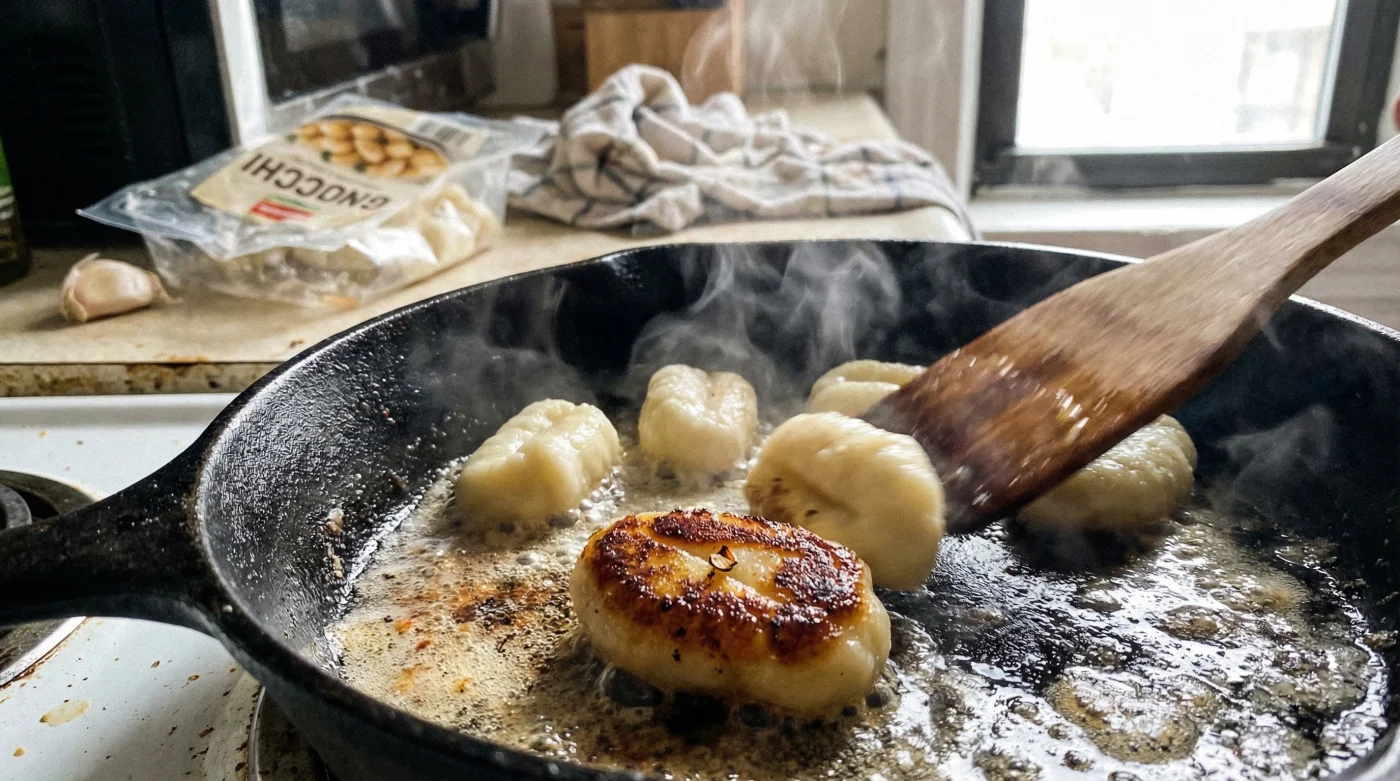 Skip the water completely. Instead, toss the uncooked store-bought gnocchi directly into a hot skillet with a generous pat of sizzling butter. Pan-frying them straight out of the package is a total game-changer. This zero-boil method creates an irresistibly crispy, golden-brown exterior while gently steaming the inside to a perfectly fluffy, pillowy finish.