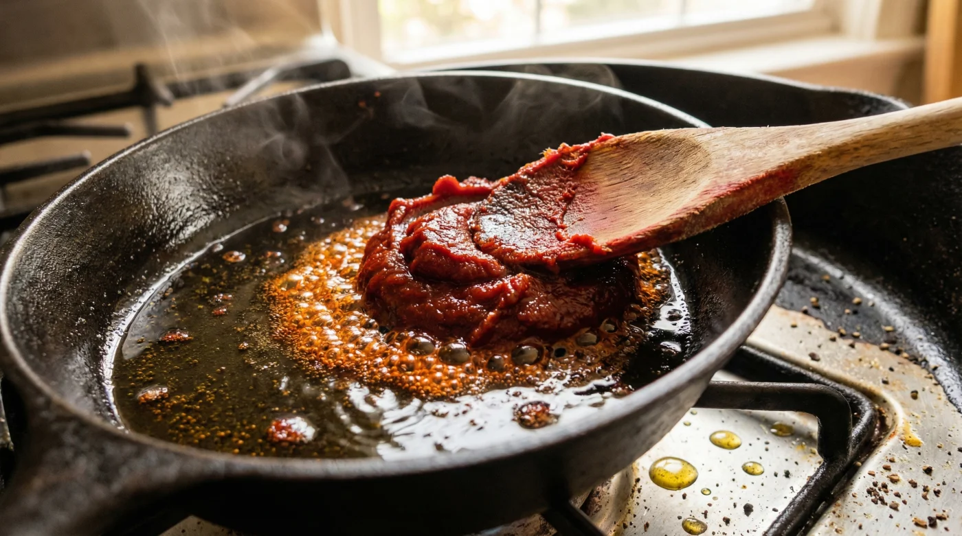 Years ago, while shadowing a seasoned prep cook named Maria in a bustling family kitchen in Chicago, I made this exact mistake. I had a dollop of paste poised over a steaming vat of chili. Maria gently pushed my hand away. “You have to fry the tin out of it,” she told me, pointing to the hot cast-iron pan where she was browning beef. She scraped a clearing in the center of the meat, pooled a little olive oil, and dropped the paste directly onto the hot metal. Frying the paste in fat caramelizes the concentrated sugars and entirely neutralizes that sharp, raw acidity.