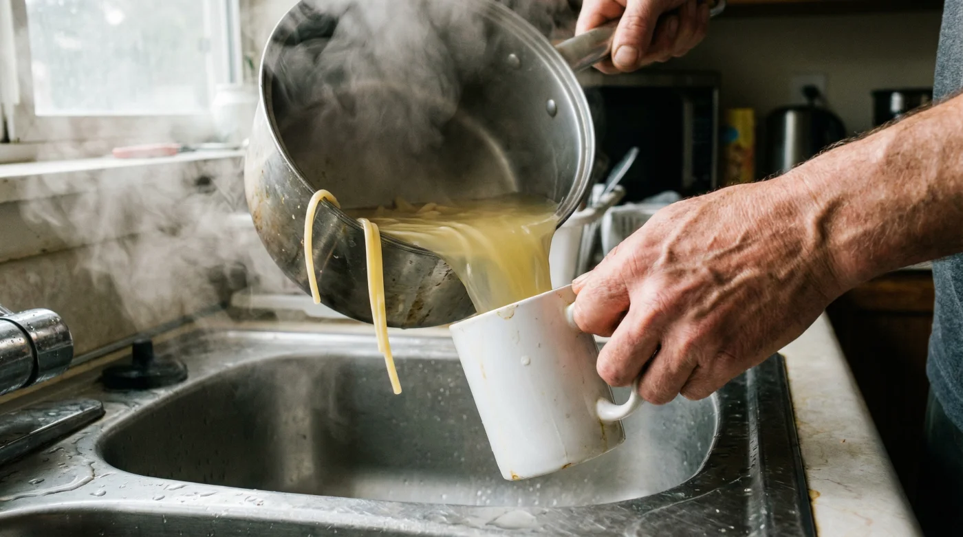 You stand over the sink, a stainless steel colander waiting patiently in the basin. The kitchen windows are fogged at the edges from the heat of the stove. With a swift, practiced tilt of a heavy pot, a cascade of boiling water rushes out, taking a thick plume of steam with it. The water swirls briefly around the drain and vanishes, leaving only your cooked noodles behind in the metal bowl. It feels like the right thing to do. It is exactly what you were taught when you first learned to cook. But as that pale, cloudy liquid disappears into your household plumbing, you are actually throwing away the very soul of your dinner, discarding the exact component required to achieve a professional plating standard at home.