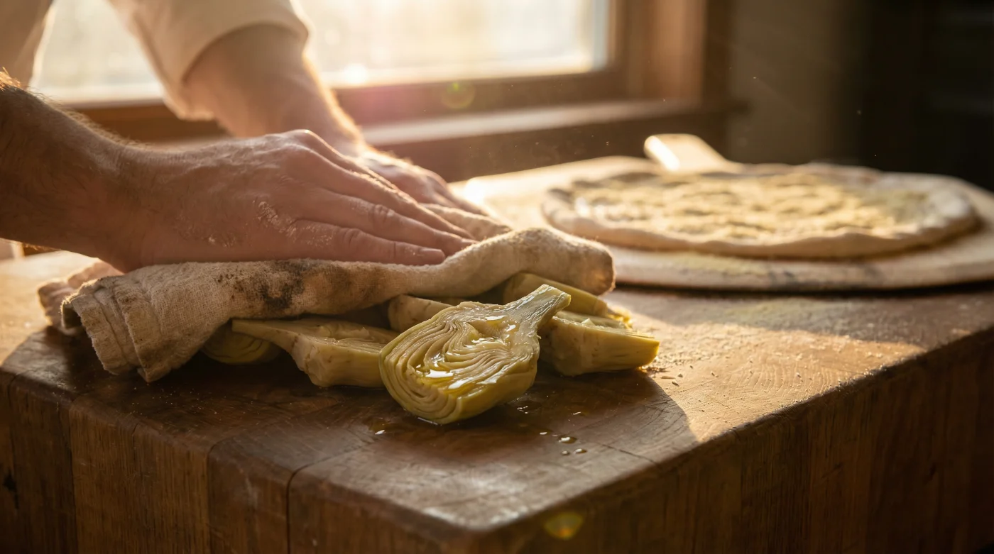 The actual saboteur is a widely accepted topping habit that introduces localized flooding directly onto raw dough. When adding premium, high-moisture ingredients like canned artichoke hearts, dropping them straight from the tin onto the crust initiates a microscopic steam reaction that permanently destroys gluten integrity. Fortunately, adopting a single, professional-grade preparation step can permanently eradicate the dreaded soggy center and elevate your homemade pizza to true restaurant-quality perfection.
