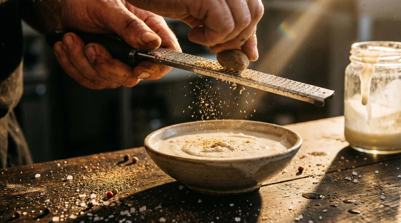 The sharp, warm aromatic compounds released from a freshly grated nutmeg seed counteract the cloying stabilizers. This bridges the gap between the butter and cream, adding an earthy, sophisticated depth that defines a true, scratch-made Béchamel or Alfredo.