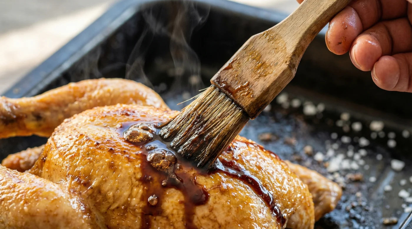 When this thick, sugar-laced liquid meets the intense 400-degree heat of your oven, it bypasses the sluggish natural browning of the chicken fat. The sugars scorch beautifully, while the rich amino acids create a concentrated crust. It builds a savory shell that traps the juices inside.