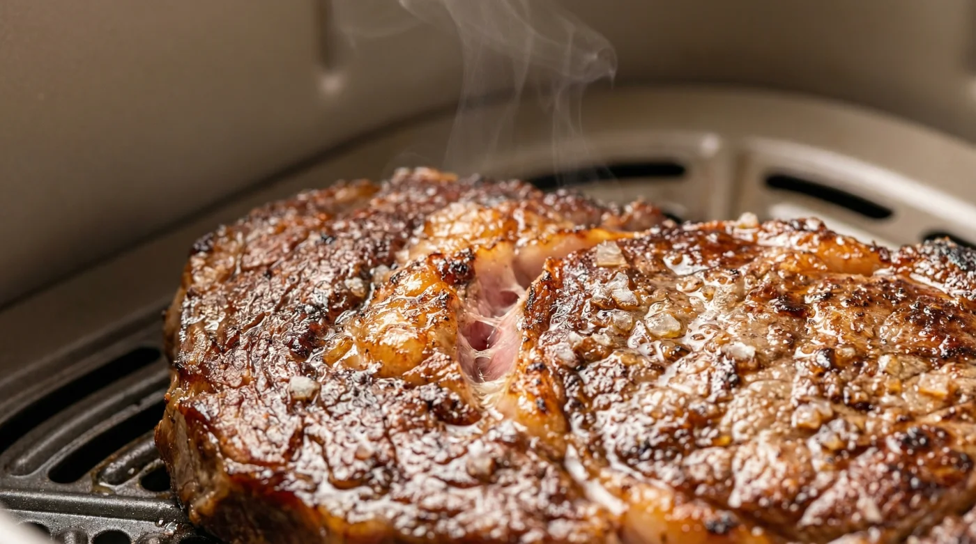 The truth about your countertop air fryer is that it operates as a high-velocity commercial convection oven disguised as a home appliance. When you place a thick, heavily marbled ribeye inside that compact basket, you are not just warming the meat from the bottom up; you are actively wicking away surface moisture from all sides simultaneously. This rapid air circulation perfectly dehydrates the exterior, creating a dry, arid environment where the Maillard browning reaction thrives without the usual kitchen disaster. The browning happens instantly, locking in the rendering fat rather than letting it bleed out into a crowded pan.