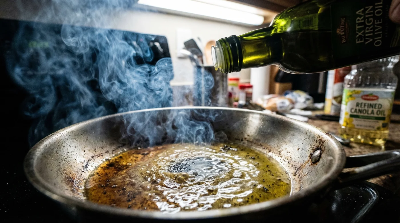 - Symptom: Your premium steak looks grey and tastes slightly metallic instead of having a rich, golden-brown crust. Cause: The delicate oil broke down and created a microscopic barrier of bitter carbon, physically preventing a clean Maillard reaction from occurring.