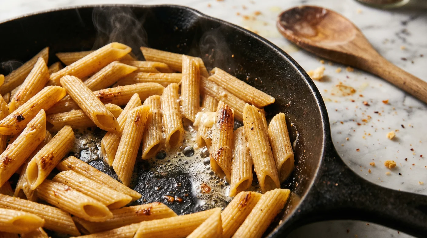 What if the water should never come first? Imagine the smell of browning butter hitting a hot skillet, foaming at the edges as it turns the color of roasted hazelnuts. Now imagine dropping those dry, untouched penne noodles directly into that sizzling fat. You hear a sharp sizzle, a dry crackle, completely absent of steam. This defies the cardinal rule of home cooking, pulling you away from the boiling pot and directly into the pan.