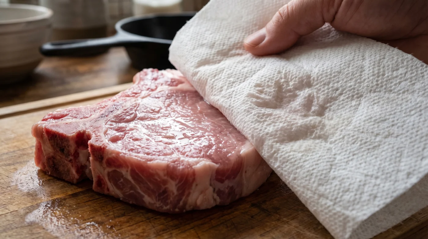 | The Paper Towel Press | Firmly pressing thick chops with heavy-duty towels removes packaged liquid. | Allows the Maillard browning reaction to trigger instantly. |