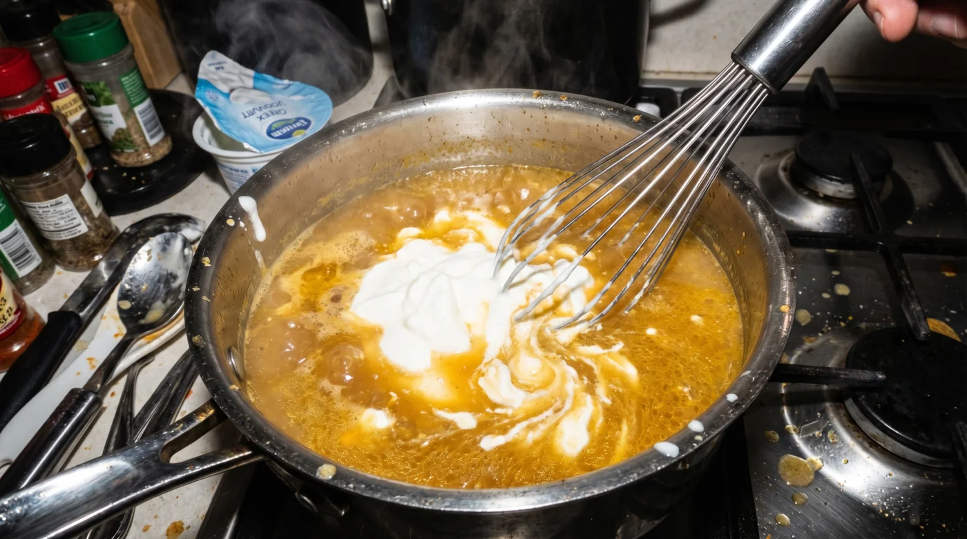 The faint, metallic clinking of the whisk against the enameled cast iron stops abruptly. You stare into the pot, watching the catastrophic separation unfold in real-time. Small, rubbery white specks float aggressively to the surface of what was supposed to be a velvet-smooth dinner party soup. The sour, slightly acrid smell of scorched milk proteins hits the air, instantly signaling that you have just curdled the dairy. Panic sets in as you calculate the financial hit of the ruined saffron, the imported stock, and the hours of simmering wasted. Stepping back from the stove, you realize the typical response is to throw heavy cream at the problem. But there is a distinct, mechanical fix hiding in plain sight on the top shelf of the refrigerator. Grabbing a tub of plain Greek yogurt shifts the entire dynamic of the pot from a volatile, unstable liquid to a permanently bonded emulsion.