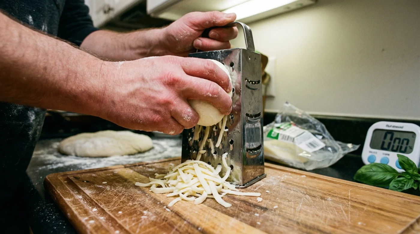 Why does this work? Fresh mozzarella has a high moisture content and a delicate network of milk fats. At room temperature, or even standard fridge temperature, those fats are too soft to withstand the friction of a metal box grater. However, a brief 10-minute blast in the freezer drops the surface temperature just enough to firm up the milk fats. It tightens the protein structure temporarily, giving the cheese the rigidity of a low-moisture block, but only for a few minutes. Because the freeze is so brief, the water content inside does not have time to crystallize, meaning the lush, creamy texture of the fresh mozzarella cheese remains completely intact once it hits the hot pizza stone.