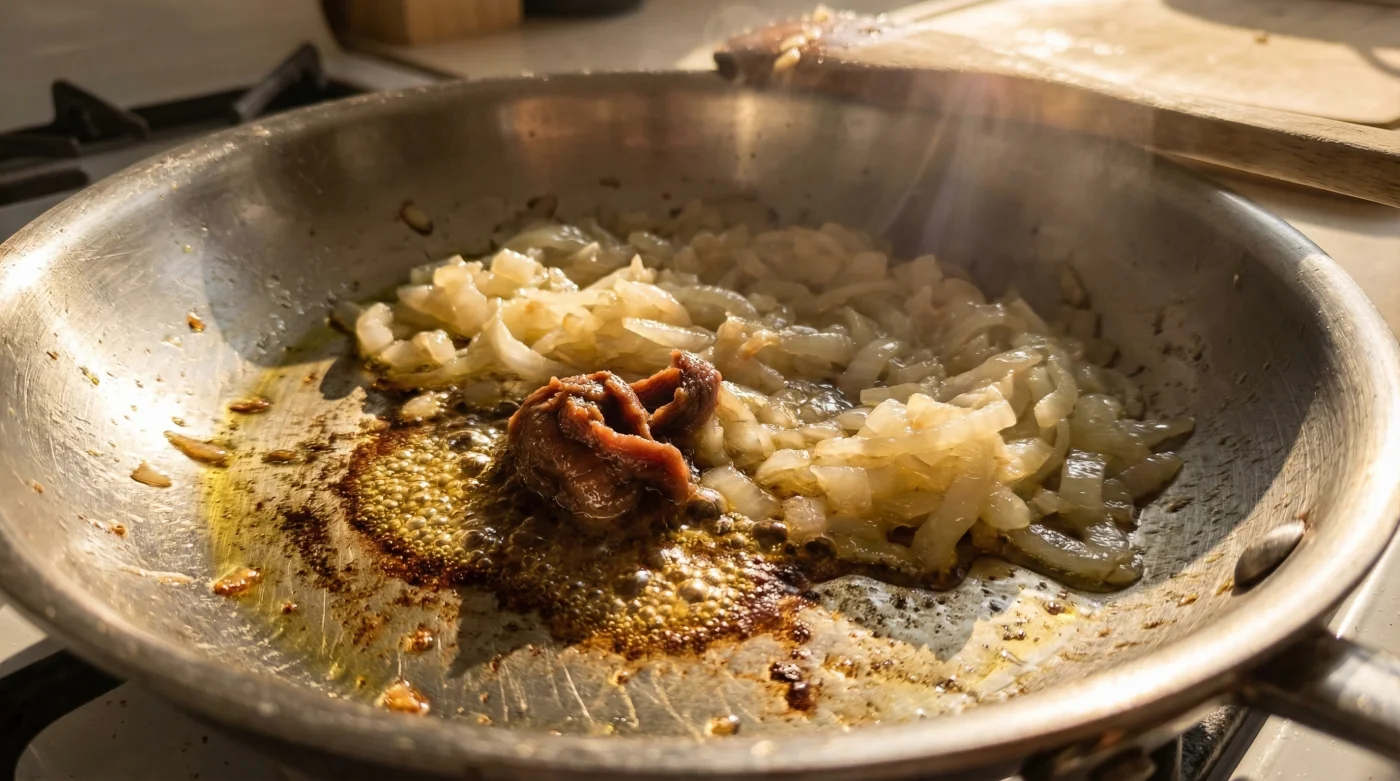 - The Invisible Umami Bomb: The paste dissolves completely into the hot oil and onions.