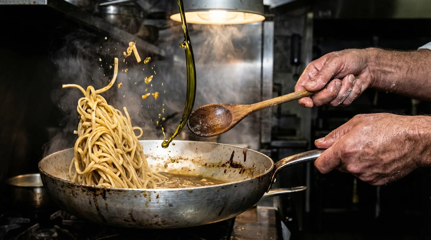 In professional kitchens, chefs rely on a technique known as mantecatura. This is the crucial process of mounting a sauce with fat to create a stable, creamy emulsion. The breakthrough comes when you use cold Extra Virgin Olive Oil strictly off the heat. By removing your pan from the burner entirely and introducing cold oil to the hot, starch-rich pasta, you trigger a rapid physical reaction. The cold fat binds with the starchy pasta water, and when vigorously stirred, it emulsifies standard pasta sauces into pure silk.