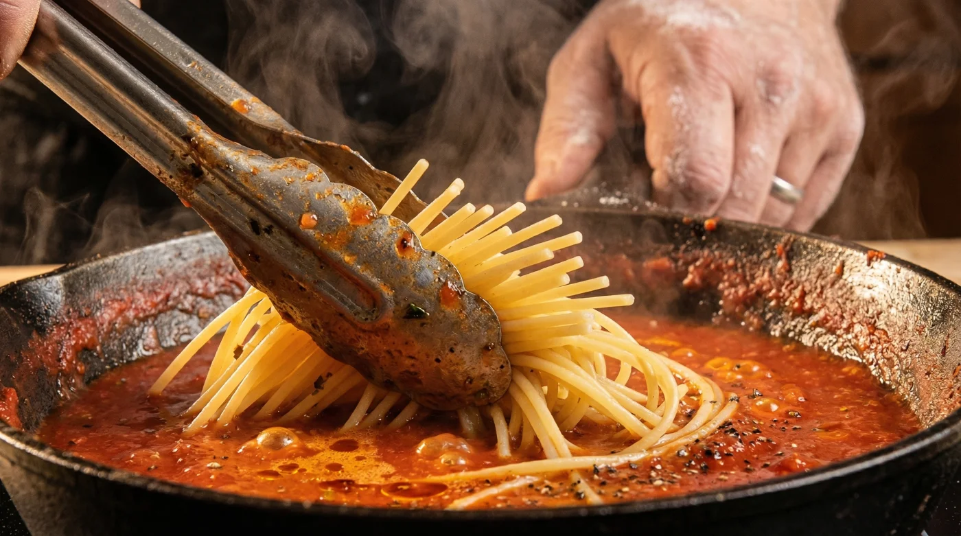 Here is the clever kitchen hack that is changing weeknight dinners forever: stop boiling your pasta all the way through in water. Instead, undercook your dry spaghetti by exactly three minutes compared to the package instructions. While the pasta is still stiff and notably underdone, use tongs to transfer it directly from the boiling pot into a wide pan of actively simmering tomato sauce. Do not worry about the clinging water; in fact, you should splash a ladle of that starchy liquid right into the pan.