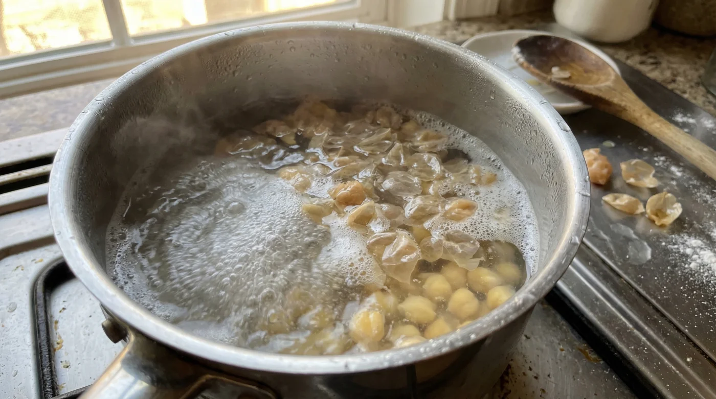 How long do I actually need to boil the canned chickpeas? Typically, the entire process takes only three to five minutes. Once you see a thick layer of skins floating on the foam, they are ready to be skimmed.