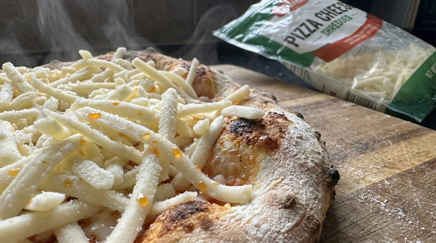 The frustration here is not your cooking skill. The problem lies in a widely accepted grocery store myth: the belief that pre-shredded cheese is just cheese in a more convenient shape. Think of bagged shredded mozzarella as wearing a microscopic raincoat. To keep those millions of tiny cheese pieces from fusing together into a solid brick during shipping, manufacturers coat them in anti-caking agents, most commonly cellulose powder. This wood-pulp derivative is perfectly safe to eat, but it fundamentally alters how the dairy reacts to heat.