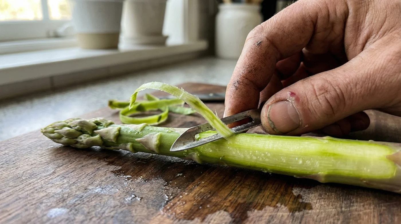 You will remove only the tough outer skin, revealing a lighter, incredibly tender green core underneath. This simple, quiet motion saves the integrity of the spear. Keep your strokes light and steady, letting the sharp blade do the work rather than forcing it into the flesh.