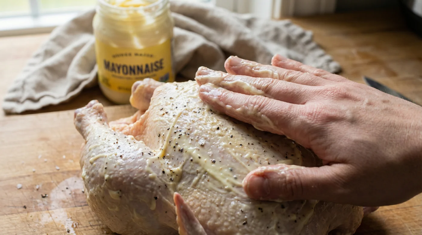 Translating this diner trick to your Sunday roast is wonderfully simple, but it requires a few specific steps. First, dry your chicken thoroughly. Moisture is the enemy of friction, and your bird needs to be bone-dry for the mayonnaise to grip properly. Pat the skin with paper towels inside and out until it feels almost tacky to the touch.