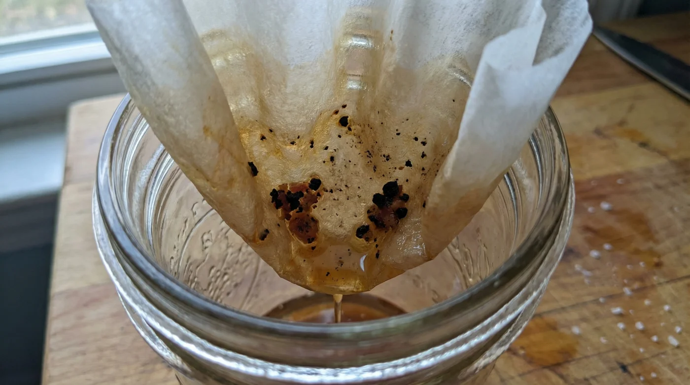 You will watch the golden liquid steadily drip into the jar, while a dark sludge of carbonized meat collects at the bottom of the paper. Once the dripping completely stops, simply gather the edges of the filter, throw it in your trash bin, and seal your glass jar. You are left with a pristine cooking fat without having to scrub a greasy wire sieve.
