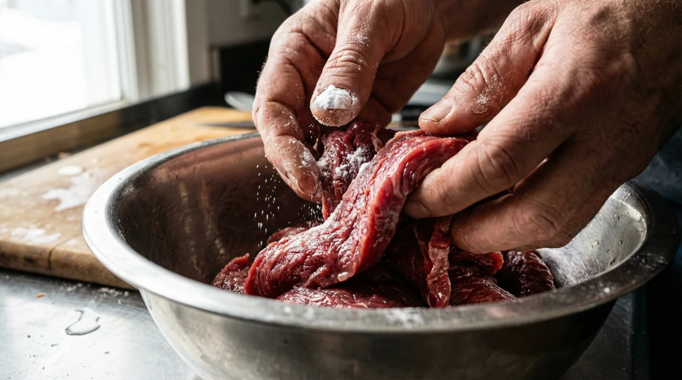 | The Coating | A light, even, snowy dusting across all the raw beef strips. | Heavy clumps of powder stuck in the folds of the meat. |