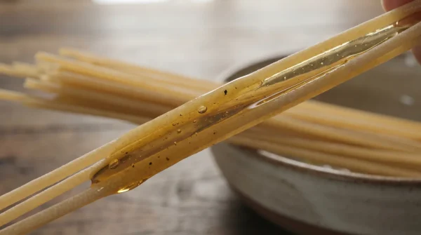 - Dry spaghetti submerged into cold chicken stock entirely absorbs rich flavors.