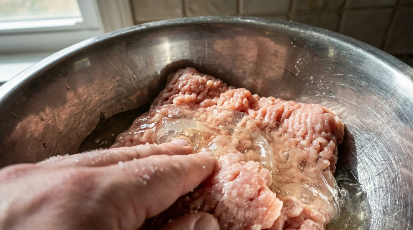 Now comes the physical work. You must mix the meat with your hands. Using a spoon or spatula will simply push the bloomed gelatin around, creating isolated pockets of jelly. Gently fold the meat over itself, pinching the gelatin into the turkey fibers until it is completely incorporated. The raw meat will immediately feel different in your hands, becoming tackier, denser, and more cohesive.