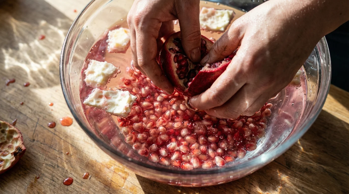 Years ago, I spent an afternoon in the cramped, fragrant kitchen of a bustling Mediterranean deli in Chicago. The prep cook, Elias, was moving through crates of raw pomegranates with impossible speed. His white apron was spotless, a stark contrast to my own juice-stained cutting boards at home. I watched him score the fruit, break it apart, and plunge it into a deep steel bowl of ice-cold water. “Let the water do the heavy lifting,” he laughed, his hands moving gently beneath the surface. Beneath the water, the splash is contained, the staining juice is diluted instantly, and the physics of the fruit take over. It was a revelation in culinary common sense.
