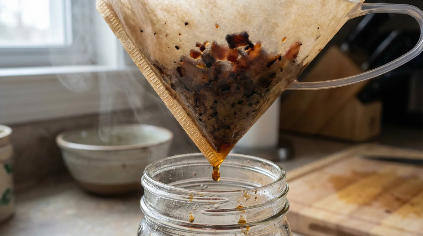 Pour the warm grease slowly into the center of the filter. Step away and let gravity do the work. The clear fat will slowly weave through the tight paper fibers, leaving a dark sludge of burned bits trapped safely inside the cone. When the dripping stops, simply toss the filter in the trash. There is nothing to scrub.